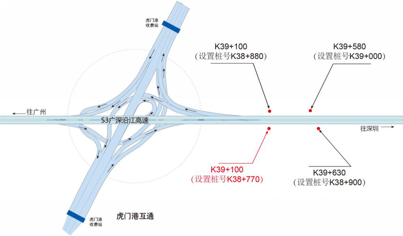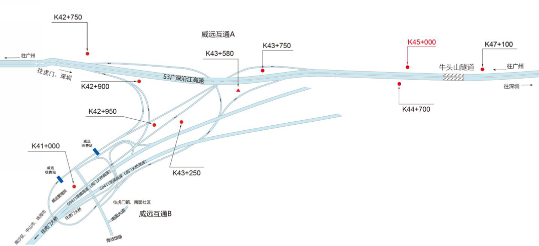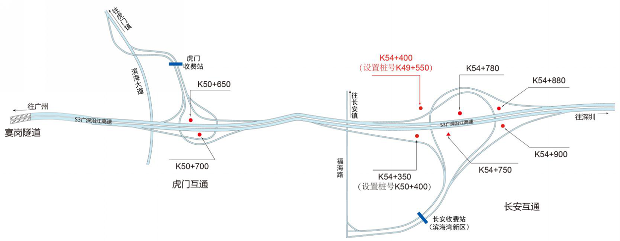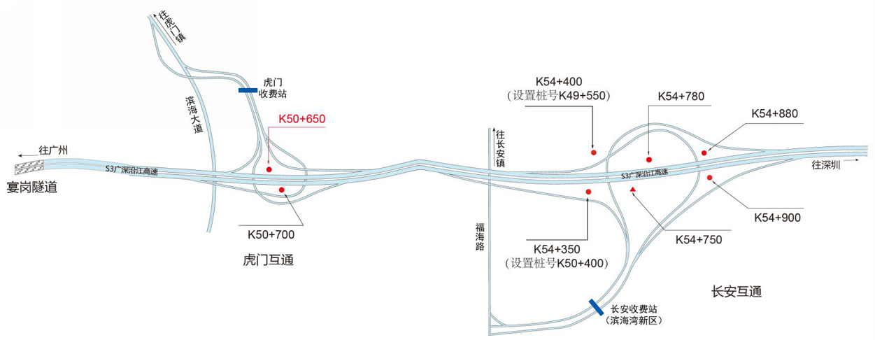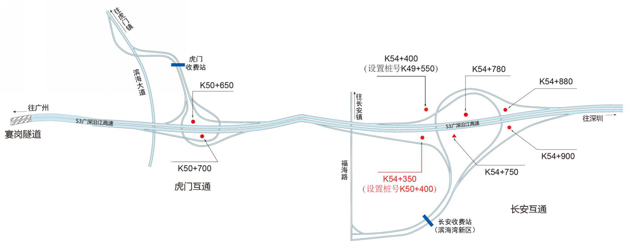 ???????廣深沿江高速公路在沿途設(shè)置12大互通:官田互通、夏港互通,南崗互通,麻涌互通(連接西部干道)、新立沙島互通、洪梅互通(連接鎮(zhèn)際聯(lián)網(wǎng)路5號(hào)路)、民田互通、沙田互通(南沙大橋互通)、虎門(mén)港互通(待建)、威遠(yuǎn)互通、虎門(mén)互通以及長(zhǎng)安互通(連接福海路、?;⒏咚傥妩c(diǎn)梅長(zhǎng)安港支線)、服務(wù)區(qū)一對(duì)(麻涌服務(wù)區(qū))。