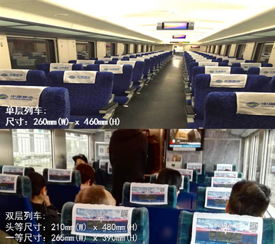 媒體形式:座位頭枕巾 車(chē)型:?jiǎn)螌?、雙層 媒體格式: 260(w)x460(h)mm 頭等:265(W)x270(H)mm 一等:210(W)x270(H)mm 媒體數(shù)量:677個(gè)/單層列車(chē),996個(gè)/雙層列車(chē) 媒體報(bào)價(jià):38萬(wàn)元/4周/列 |