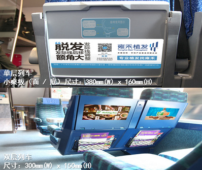 媒體形式:座位小桌板 車(chē)型:?jiǎn)螌?、雙層 媒體格式: 單層=380(w)x160(h)mm 雙層=300(w)x150(h)mm 媒體數(shù)量:677對(duì)/單層列車(chē),732個(gè)/雙層列車(chē) 媒體報(bào)價(jià):26萬(wàn)元/4周/列 |