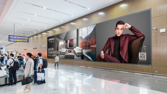 青島膠東機場到達行李廳墻面大型燈箱廣告巨大的廣告畫面幾乎占據(jù)了旅客視野中的一整面墻,在行李廳這個功能明確、視覺干擾相對較少的空間中,能夠自然形成視覺焦點,產(chǎn)生強烈的視覺沖擊力與記憶點。旅客在行李轉(zhuǎn)盤旁固定區(qū)域等候,與墻面廣告的物理距離非常近,通常僅數(shù)米至十余米。這種近距離關(guān)系使得廣告畫面的細節(jié)清晰可見,視覺包圍感強,容易營造沉浸式的品牌體驗,