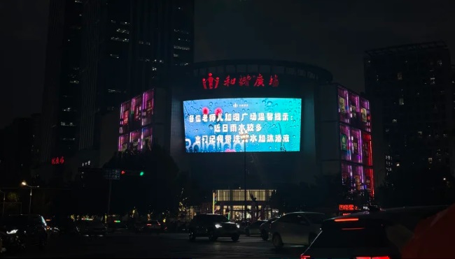 濟南和諧廣場外墻LED大屏廣告獨特的弧形設計在建筑立面上形成了獨特的視覺張力,不僅與建筑外觀更好融合,還能提供更寬廣的視角覆蓋,在復雜的城市環(huán)境中保持強烈的視覺存在感與沖擊力。大屏位于商場外墻玻璃幕墻上方高處醒目位置,視野開闊,無遮擋,使廣告信息能夠遠距離清晰辨識,實現(xiàn)了對主干道雙向車流及行人的廣域覆蓋。高頻次的播放策略能夠對日間不同時段經過的龐大人流和車流進行反復提示,有效利用乘客和駕駛者的碎片化等待時間,強化品牌認知。